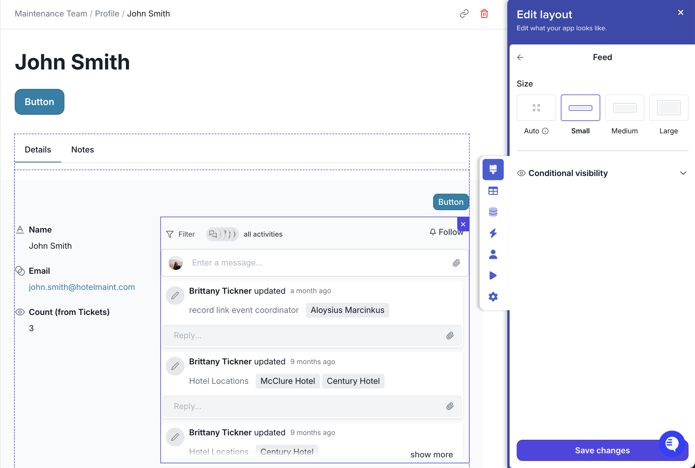The activity feed can be found on a detail page for a record. Here you can track record updates, messages, and follow new activity on the selected record.&#x20;